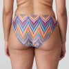 Culotte de bikini en maille rayée affichant des rayures et une bande unie à la taille. Mai Tai est un mélange de rose vif, d’orange et de doré.