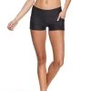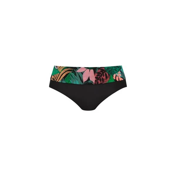 Black bikini bottom with an upper band featuring emerald green print accentuated with tropical motifs. Classic cut.