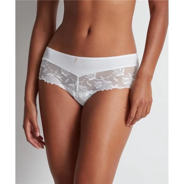 Lycra® mesh and embroidered tulle shorty, wide edges, rhinestone jewel at the waist, sexy cutout at the back with pompom bow. 100% cotton lining.