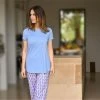 Night camisole in soft viscose with lace around the bust. Adjustable straps. Hand-painted motifs inspired by the Mediterranean blue sky. Composition: 89% Viscose, 6% Elastane, 5% Polyamide.