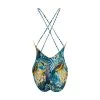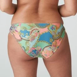 Bikini bottoms with a shiny fabric that captures sunlight. Color: ”Italian chic” in shades of green, blue, and coral.