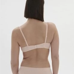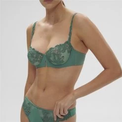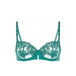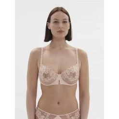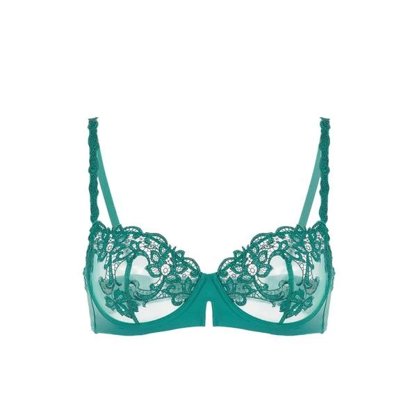 Balconette bra without padding, in embroidery with underwire, rounded shape, adjustable straps adorned with lace.