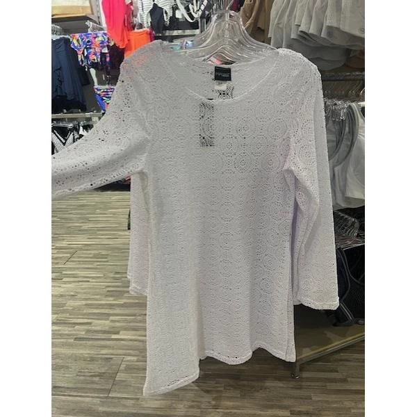 Sheer crochet beach dress with long sleeves, reaching above the knee.
