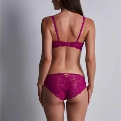 French jacquard lace low-rise panties, slightly cheeky cut, seamless leg openings for discreet wear. Elastic waistband, seductive back opening with crisscrossed ties and golden spiral jewelry. 100% cotton-lined gusset.