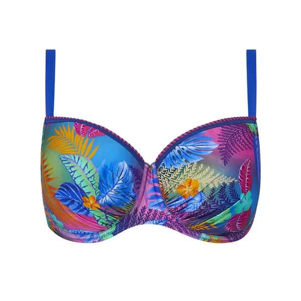 Padded underwire bikini top: Stretch fabric, quick-drying. Padded cups, rounded support. Crochet trim. Double-layered tulle back, reinforced support. Adjustable straps & option to cross. Composition: 42% Polyamide, 33% Polyurethane, 15% Polyester, 10% Elastane.