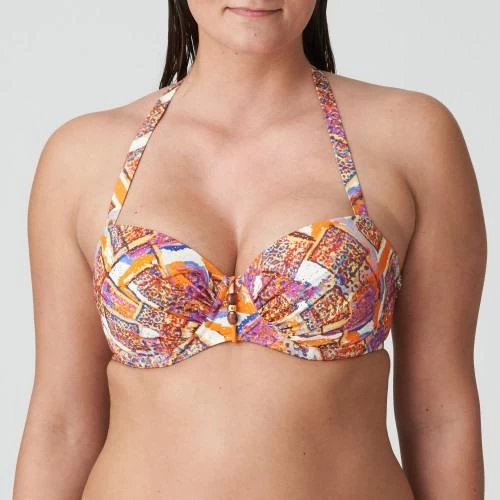 Haut de maillot avec un imprimé ethnique disco et des bonnets en mousse en forme de balconnet. Les reflets dorés captent la lumière du soleil. Summer Sunset combine les couleurs d’un coucher de soleil méridional avec des paillettes roses, bleues et dorées.
