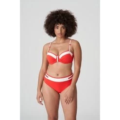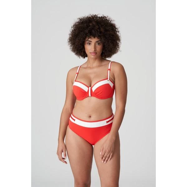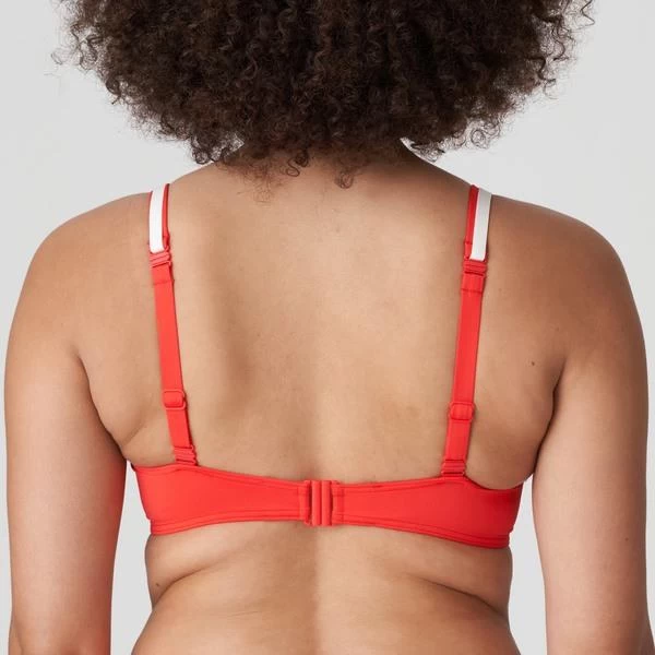 Haut de bikini avec un jeu de lignes graphiques qui accentue votre décolleté. Le bonnets en mousse a des détails dorés chics. Le rouge vif de Pomme D’Amour, subtilement associé au blanc pour une allure sportive.