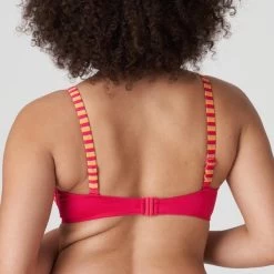 Haut de bikini avec bonnets en mousse et coupe balconnet. Le joli contraste entre rayures et tissu uni et la texture à fines rayures créent une silhouette ultra-féminine. Mai Tai est un mélange de rose vif, d’orange et de doré.