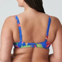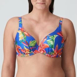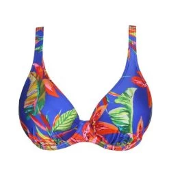Swimsuit featuring a deep neckline, jungle print, and padded triangular cups. Perfect for fuller busts. The Tropical Rainforest pattern combines vibrant blue, jungle green, and orange. Composition: 60% Polyamide, 22% Polyester, 18% Elastane.