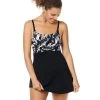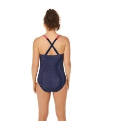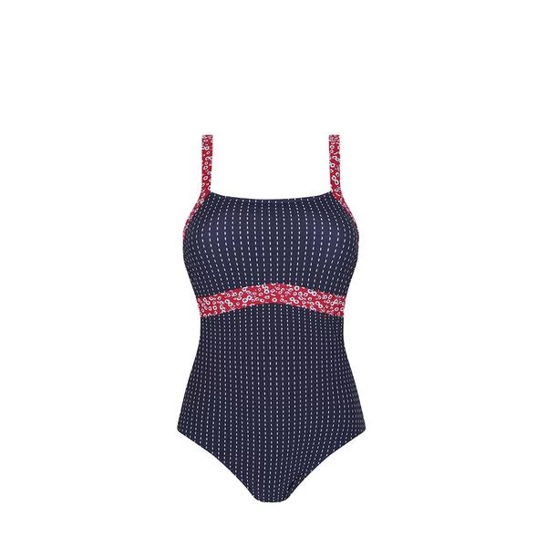 One-piece swimsuit with stripes and floral inserts. Made from regenerated nylon*, taking a stance in favor of sustainability and environmental protection. UV protection 50+. Made with LYCRA® XTRA LIFE™, with high resistance to chlorine. Wide and comfortable straps offer different wearing options: straight, halter neck, or crossed. Inner bra featuring integrated bilateral pockets and padded cups, securely holding prostheses in place.
