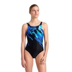 Adjustable straps, built-in bra, and reinforced back for reliable support. Made with MaxFit Eco, stretchable in four directions for optimal comfort. Graphic pattern. Ideal for pool swimming. Composition: 80% polyamide, 20% elastane.