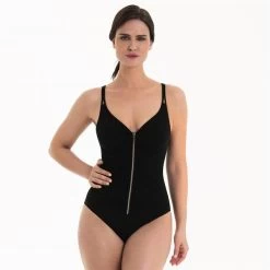 Sporty one-piece with front zipper. Small decorative opening on the shoulder straps. Adjustable straps.