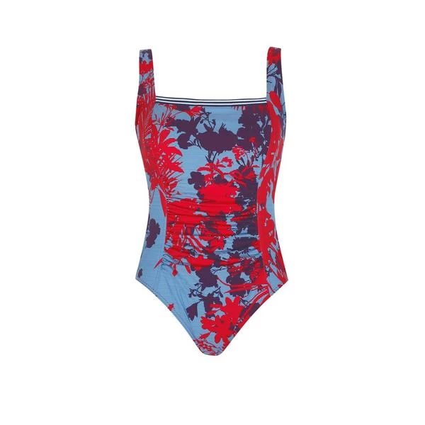 A one-piece swimsuit that provides exceptional abdominal support, featuring a square neckline with an elastic band, adjustable straps that can be crossed, and it has been specially designed to accommodate a prosthesis following a mastectomy.