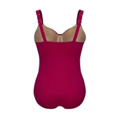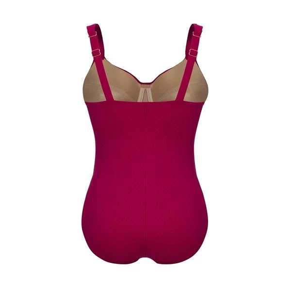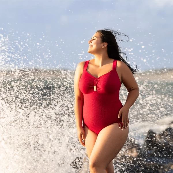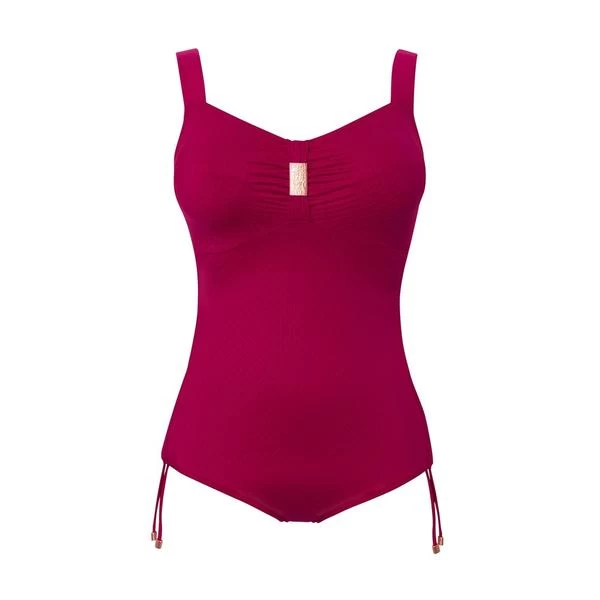 One-piece swimsuit with underwire providing excellent support. Comfortable straps with adjustable foam padding. Adjustable decorative cords on each side.