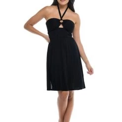 Robe de plage mais peut se porter en robe de soirée. Robe qui s’attache au cou avec des cups au seins qui peuvent être retiré. Le dos s’étire bien et la corde au cou peut être retiré pour un effet plus bandeau.