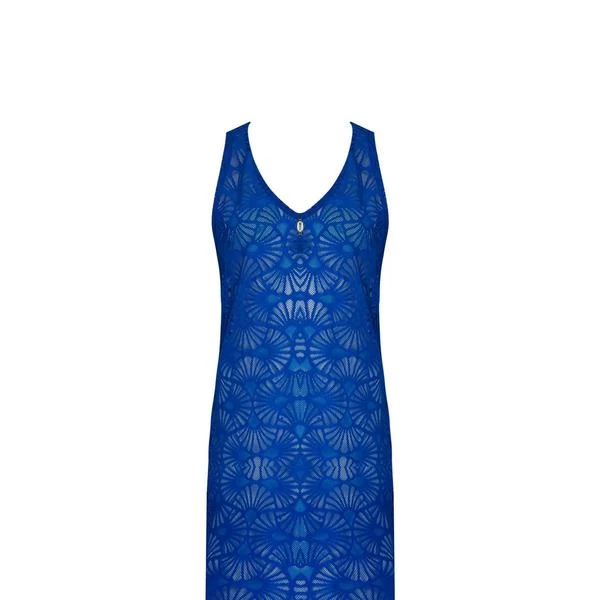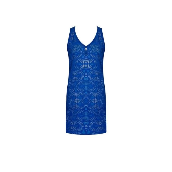 Short lace dress in a solid color with a jewel detail at the bottom of the neckline. Above knee length.