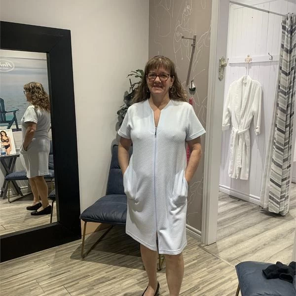 Comfortable knee-length dress with short sleeves, featuring a full-length zipper and convenient pockets.