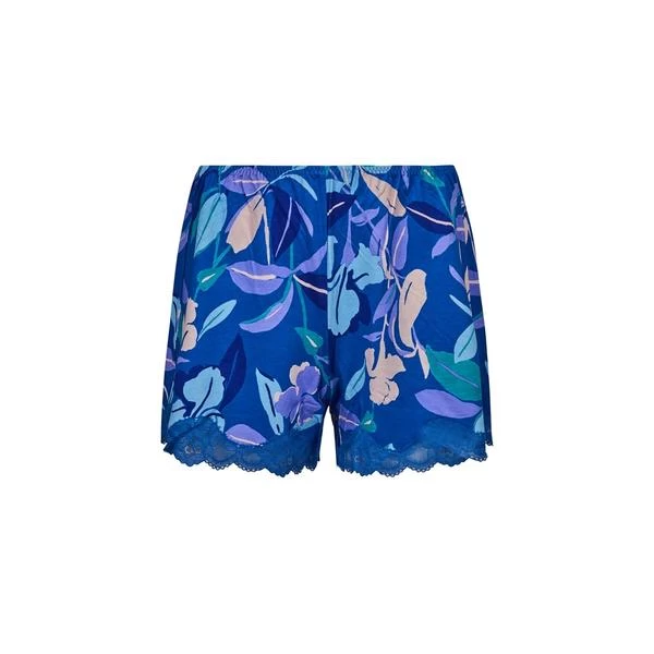 Night shorts in soft viscose with lace around the thigh. Hand-painted motifs inspired by the Mediterranean blue sky. Composition: 89% Viscose, 6% Elastane, 5% Polyamide.