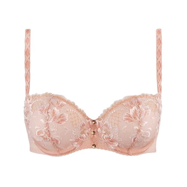 Soutien mélodie d’Été. Décolleté pigeonnant, dentelles florales, broderies rosées, allure élégante avec lurex doré, bretelles tressées, boutons dorés, touche d’or rosé, féminité subtile.