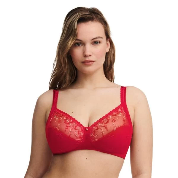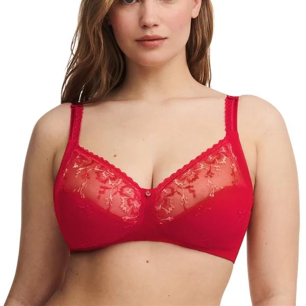 Wireless bra with floral embroidery on the cups. Decorated wide straps, Chantelle medal between the cups.