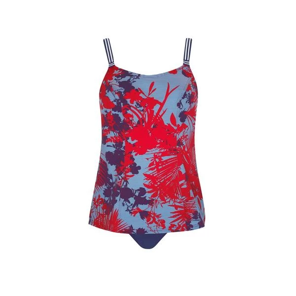 Tankini comprising the top and bottom. The swimsuit bottom is high-waisted in navy blue. The straps are adjustable and can be crossed at the back.
