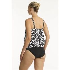 Multifit tankini blouson with soft cup support, floating bra sheath, adjustable and convertible straps, and power mesh support.