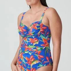 Tankini top with enveloping cups. Adjustable straps with the option to cross. Tropical Rainforest: Combination of vibrant blue, jungle green, and orange. Composition: 68% Polyamide, 22% Elastane, 10% Polyester.