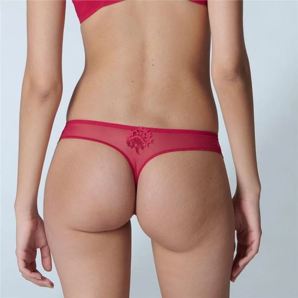 Opaque mesh thong with front center panel for added coverage. Featuring embroidery and lace.