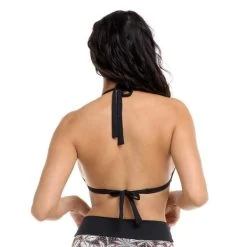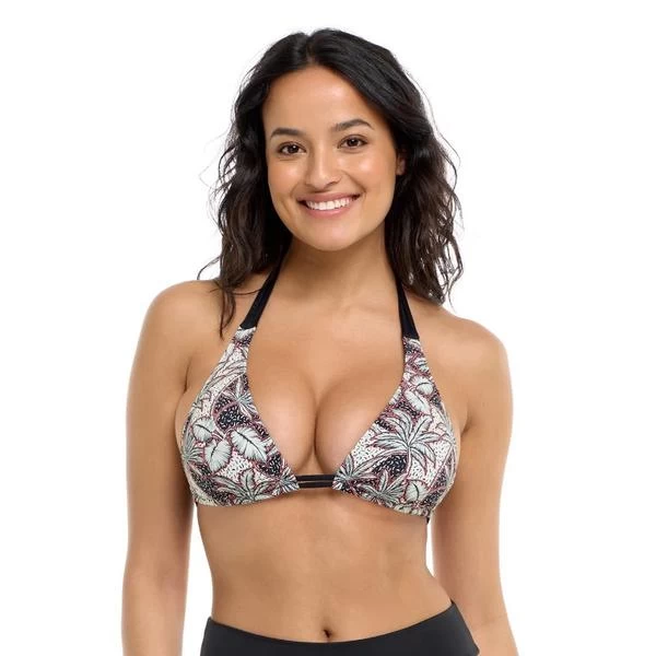 Sliding triangle bikini top with removable soft cups, made from glossy fabric. Features two sliding bands under the bust and tied cords at the neck and back.