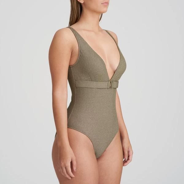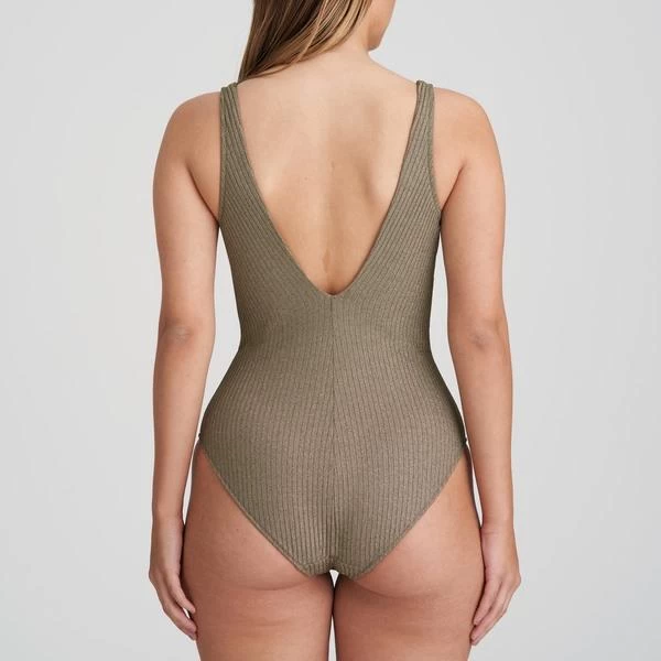 One-piece swimsuit with a deep V-neck, deep cutouts in the front and back, and a slightly shiny fabric.